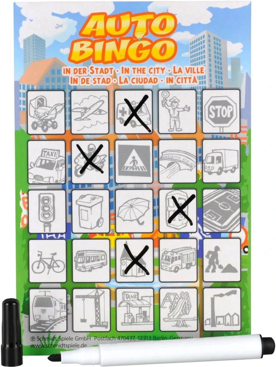 Eenvoudig zoekspel voor kinderen. Kijk tijdens een autorit of een andere reis naar buiten en zoek naar overeenkomende afbeeldingen op je bingokaart. Wie heeft als eerste vijf afbeeldingen op een rij?