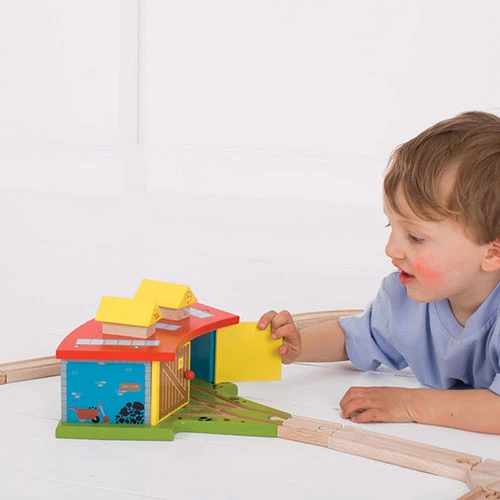 Toegang tot alle gebieden! Met ruimte voor drie locomotieven en met wijd openslaande deuren is deze drievoudige locomotiefloods de spil van het houten spoorwegnet. Jonge spoorbeheerders kunnen de activiteiten overzien via een open achtergedeelte en vervolgens plannen welke van hun favoriete locomotieven er naast vertrekken. Een geweldige manier om creativiteit te stimuleren, de drievoudige locomotiefloods stimuleert ook netheid en orde, met een plek om rollend materieel op te slaan wanneer het niet in gebruik is. De meeste andere grote merken houten spoorwegen zijn compatibel met Bigjigs Rail. Gemaakt van hoogwaardige, verantwoorde materialen. Voldoet aan de huidige Europese veiligheidsnormen.
