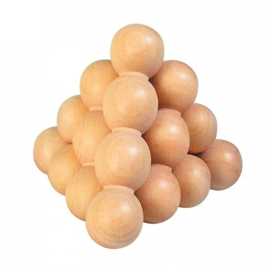 6-delige puzzel, in een katoenen zakje, waarmee een kogelpyramide gebouwd dient te worden. Niet moeilijk?