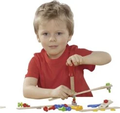 140-delige constructieset in doos, compleet met bouwtekeningen en schroevendraaier.Β De set bestaat uit 140Β delen; plankjes, blokjes, gootjes, schroeven en moeren.
