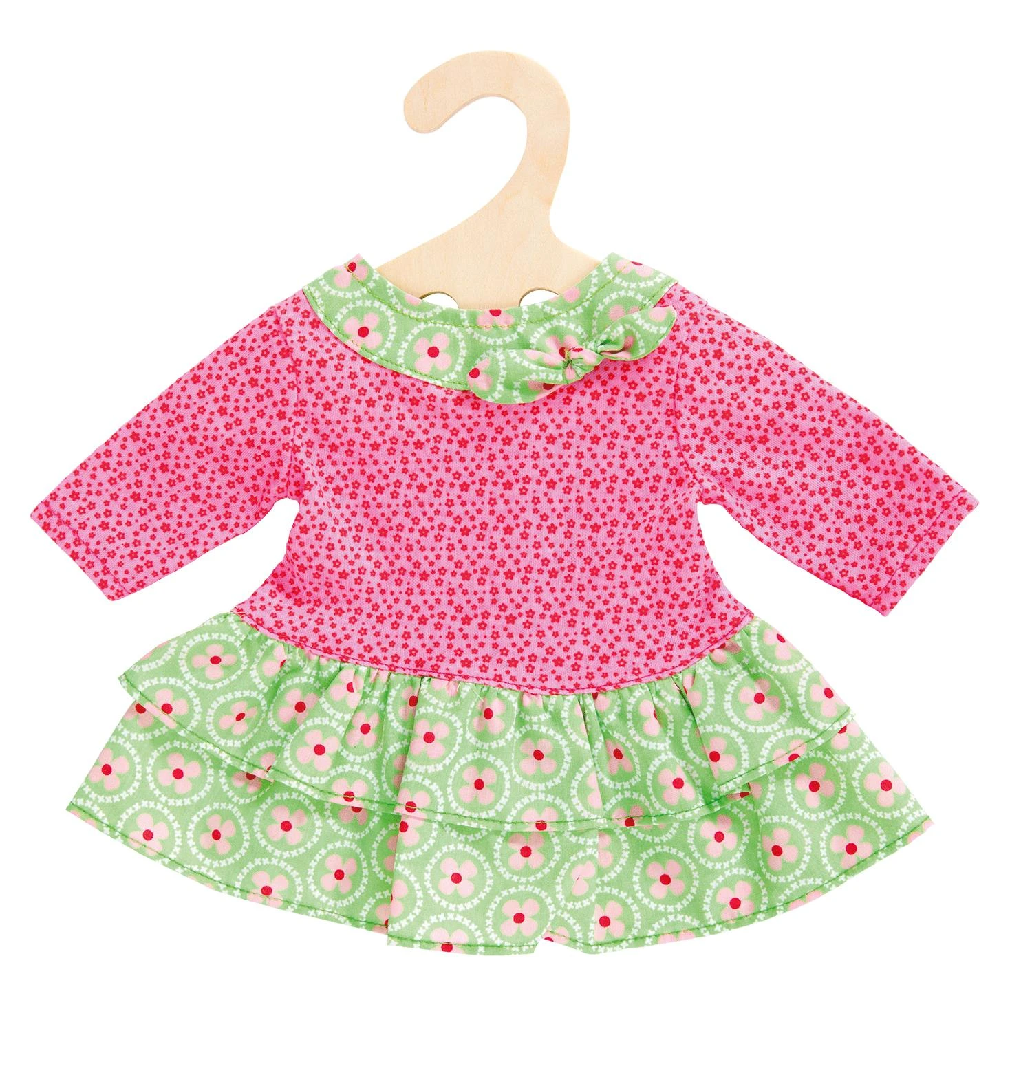 Vrolijk poppenjurkje met een strokenrokje in leuke kleurstelling. Compleet met kleerhangertje.