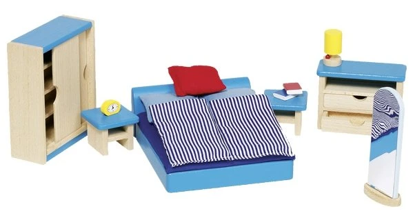 14-delige meubel- en accessoireset voor poppenhuis .De set bestaat uit o.a. een 2-persoons bed, nachtkastjes, kledingkast, kommode, passpiegel enz.
