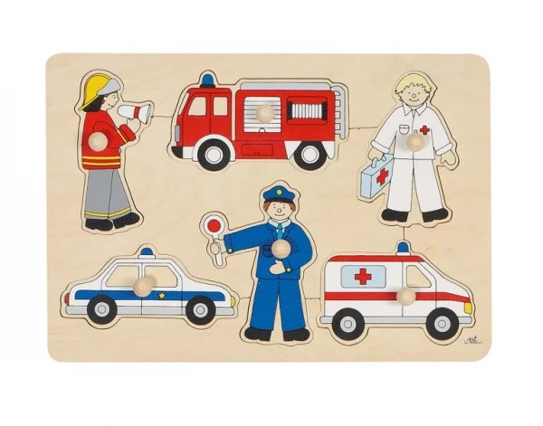 Houten noppenpuzzel met 6 puzzelstukken in het thema hulpverlening.