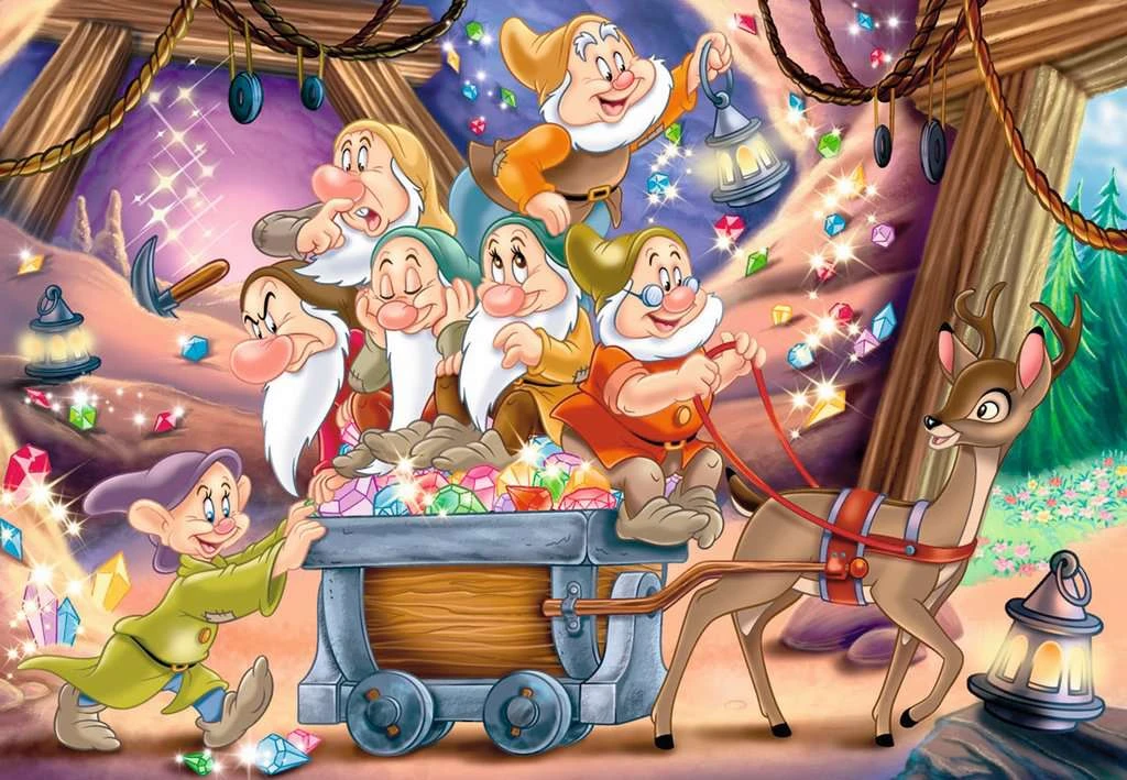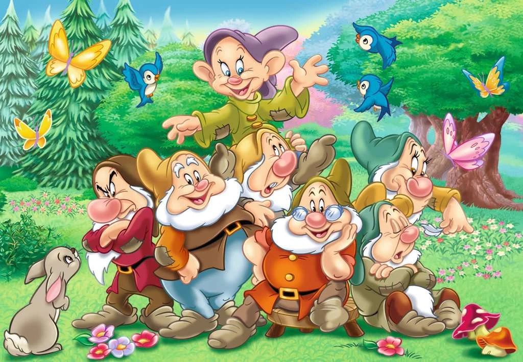 2 kinderpuzzels van 24 stukjes met afbeeldingen uit de Disneyfilm sneeuwwitje en de 7 dwergen .